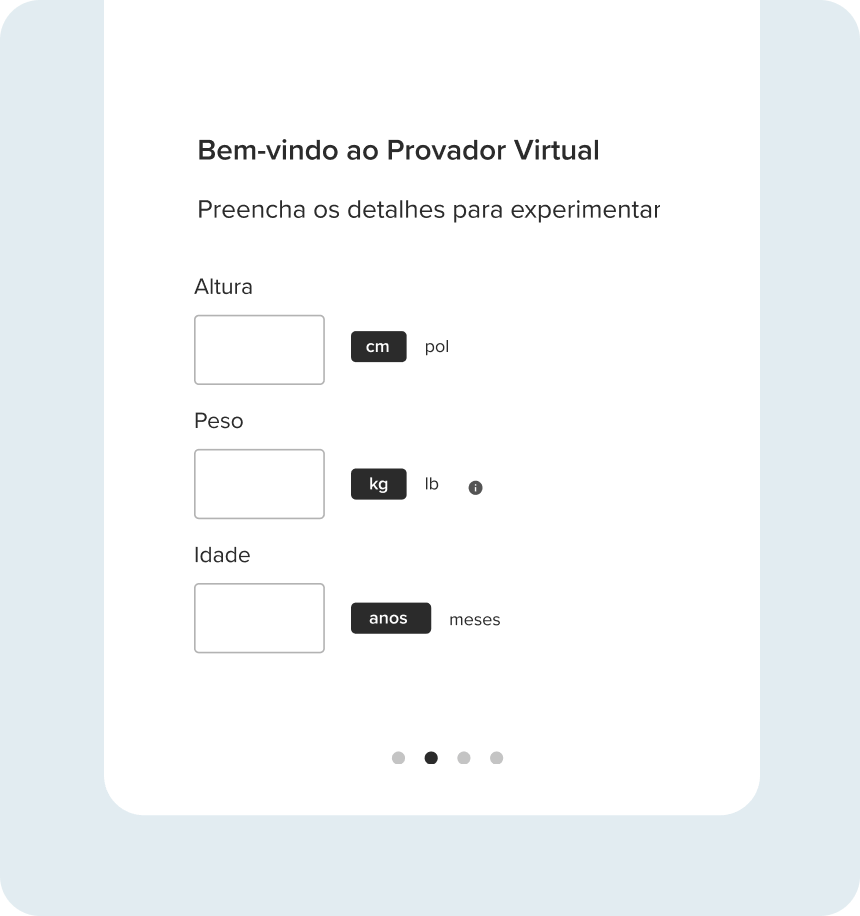 Garanta que seus clientes comprem o tamanho certo informando apenas altura, peso e idade.
