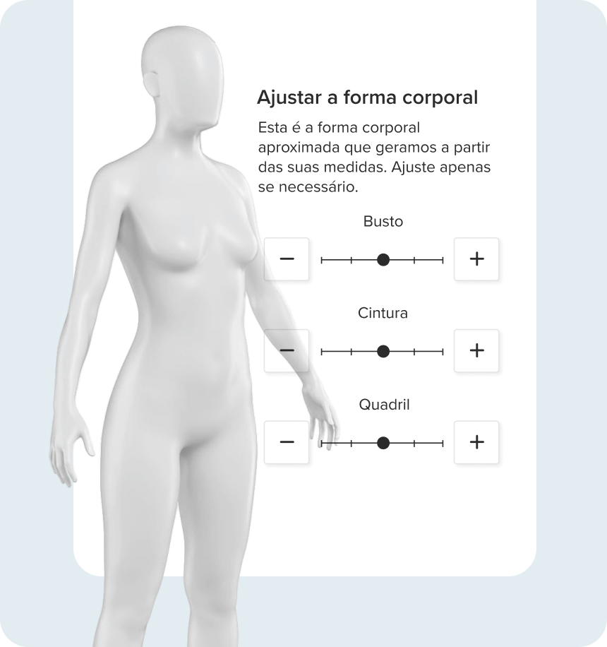 A ferramenta utiliza dados corporais como peso, altura, idade, e também pedem para o usuário validar a distribuição de massa corporal. Então, a antropometria é aplicada sobre estes dados para “estimar” até 7 medidas corporais com grande precisão. Tendo os dados corporais e as informações das tabelas de medidas, o algoritmo de recomendação de tamanho cruza ambos os dados para criar sugestões de tamanho específicas para as medidas corporais do usuário. Leia mais sobre como funciona.